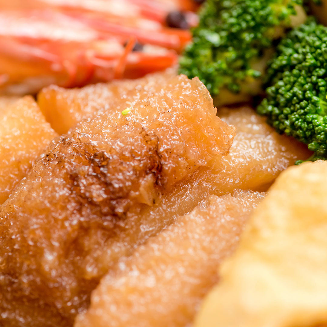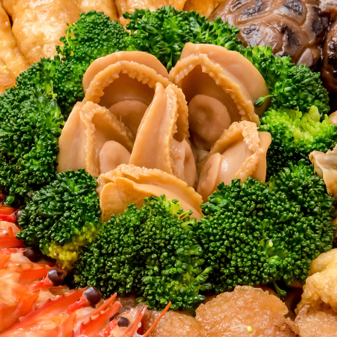 Ingredients: Abalone, Prawn, Fish Maw, Sea Cucumber, Dried Scallop, Dried Mushroom, Dried Oyster, Pork Tendon, Chinese Sausage, Pork Belly, Duck Feet, Fish Slices, Fatt Choy, Meat Ball, Broccoli, Lotus Root, White Radish, Tofu, Superior Broth.